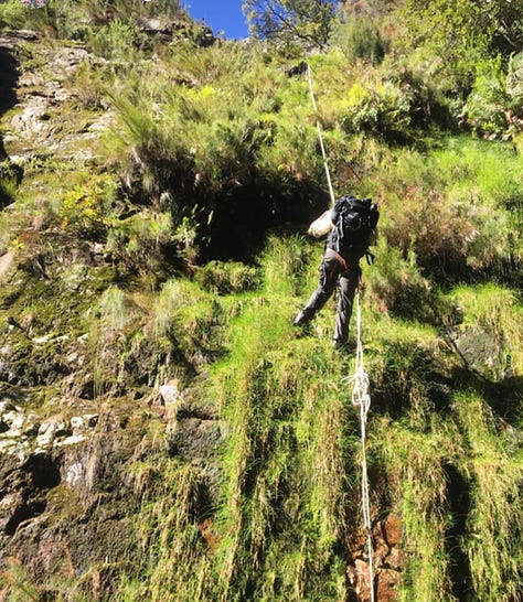 Because the route is rated as extremely difficult, few people attempt it. Consequently, there were no clear paths – the terrain was wild. It took us longer than we hoped to find the first rappelling site, but wow, what a stunning location! Rappelling down in cold mountain water was exactly what our bodies craved after the hot and sweaty hike up. Yet, simultaneously, we had to give each movement our attention as the cliffs were slippery, and a wrong move could result in serious injury. Amidst such beauty, intimate immersion in nature, and intense attention to detail, it is easy to lose track of time.